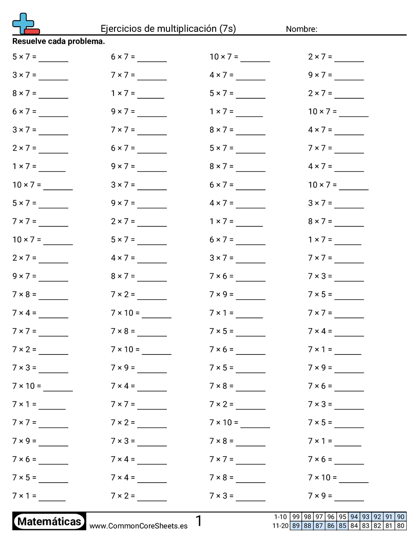 Hojas de trabajo gratis de math sobre Ejercicios de multiplicación (7s) . Cada hoja tiene 100 ejercicios con hoja de respuestas y es ideal para maestros y educación en casa. Puedes descargar el PDF, crear tarjetas de memoria o configurarlo para aprendizaje en línea.