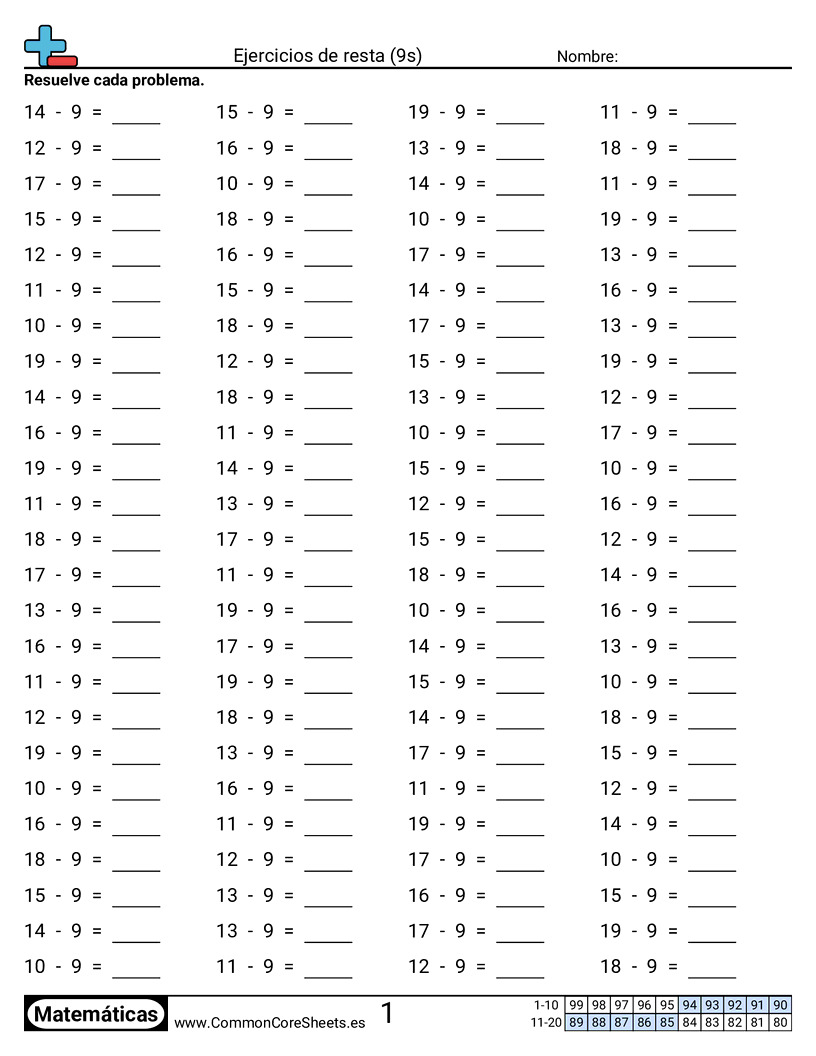 Hojas de trabajo gratis de math sobre Ejercicios de resta (9s) . Cada hoja tiene 100 ejercicios con hoja de respuestas y es ideal para maestros y educación en casa. Puedes descargar el PDF, crear tarjetas de memoria o configurarlo para aprendizaje en línea.