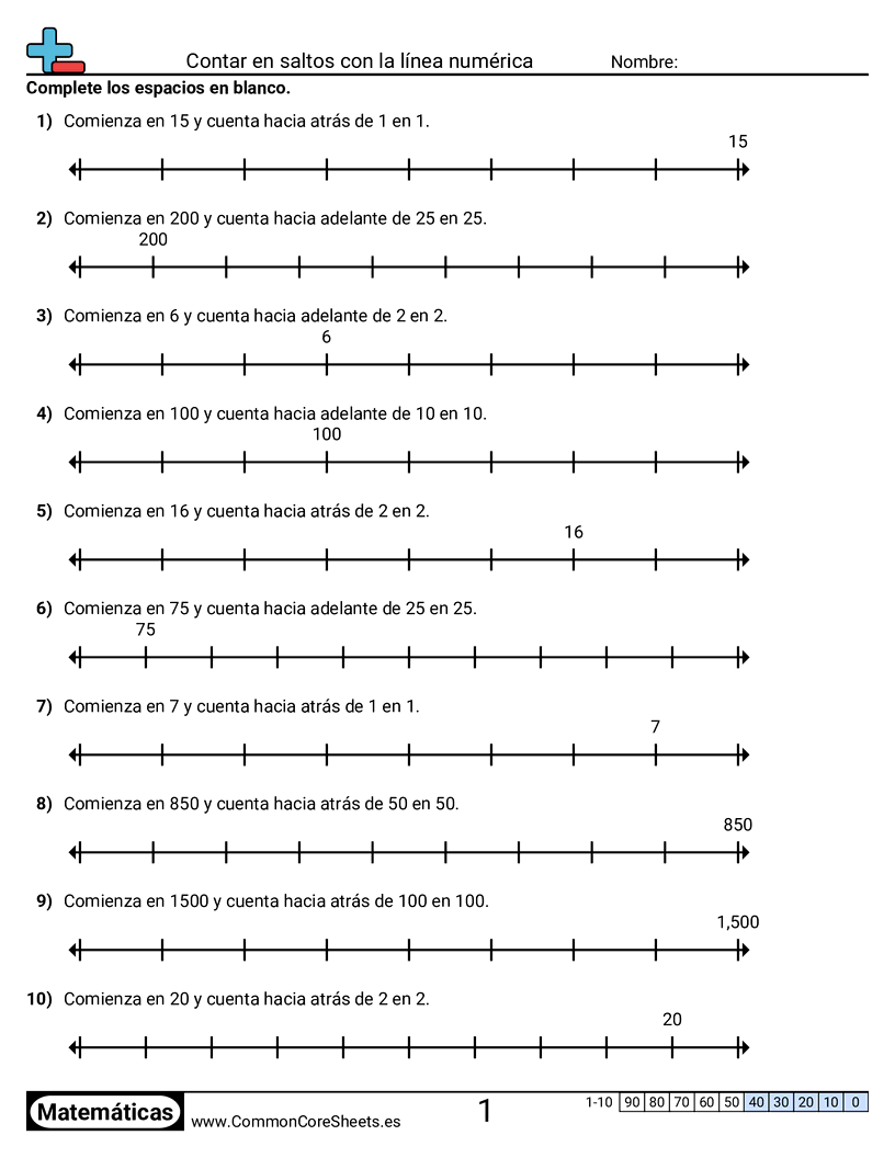 Hojas de trabajo gratis de math sobre Contar en saltos con la línea numérica. Cada hoja tiene 10 ejercicios con hoja de respuestas y es ideal para maestros y educación en casa. Puedes descargar el PDF, crear tarjetas de memoria o configurarlo para aprendizaje en línea.