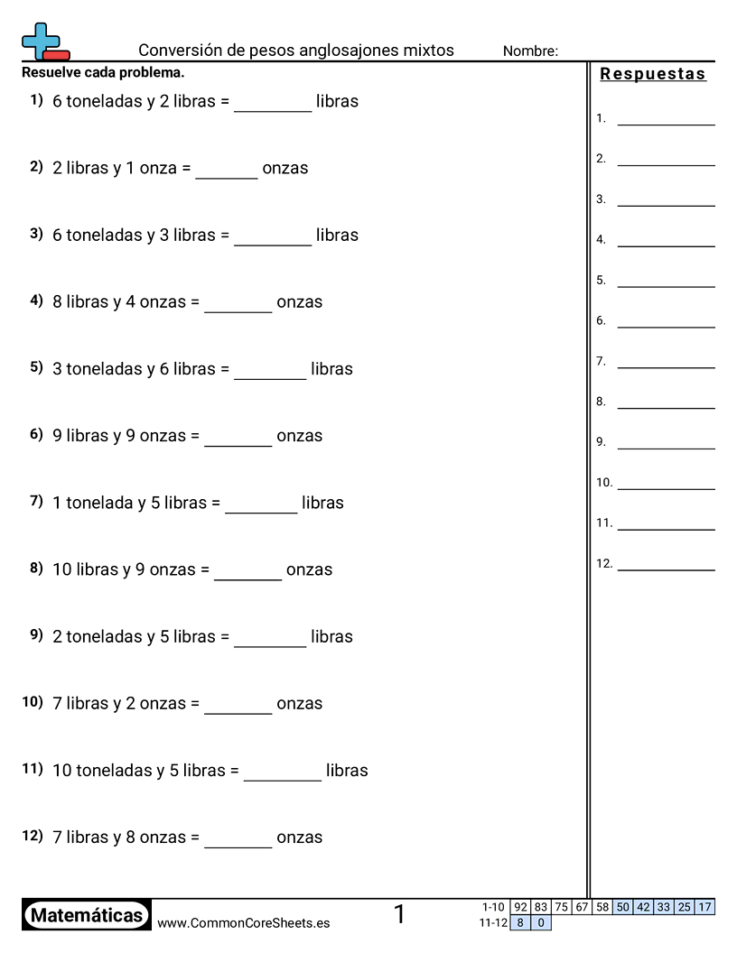 Hojas de trabajo gratis de math sobre Conversión de pesos anglosajones mixtos. Cada hoja tiene 12 ejercicios con hoja de respuestas y es ideal para maestros y educación en casa. Puedes descargar el PDF, crear tarjetas de memoria o configurarlo para aprendizaje en línea.
