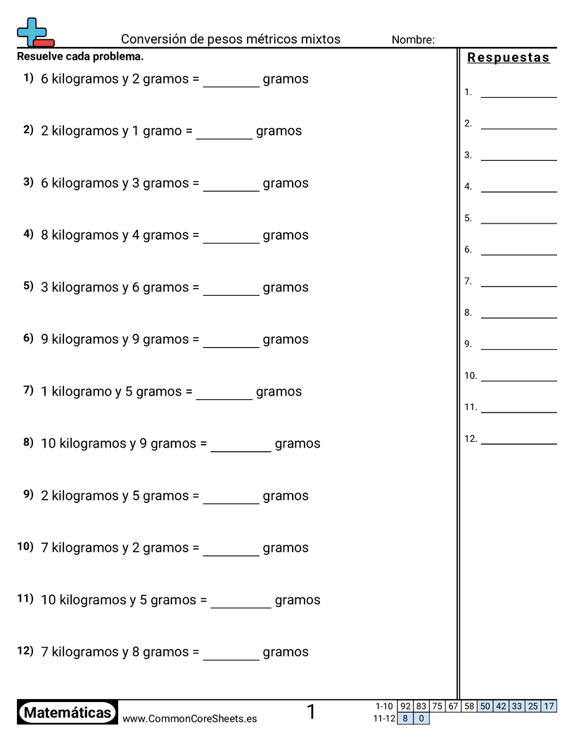 Hojas de trabajo gratis de math sobre Conversión de pesos métricos mixtos. Cada hoja tiene 12 ejercicios con hoja de respuestas y es ideal para maestros y educación en casa. Puedes descargar el PDF, crear tarjetas de memoria o configurarlo para aprendizaje en línea.