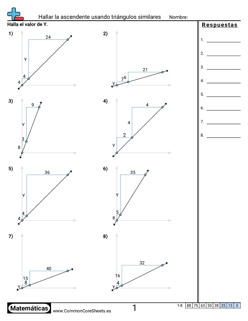 Hojas de trabajo gratis de math para 8vo Grado (8ee6) sobre Hallar la ascendente usando triángulos similares. Cada hoja tiene 8 ejercicios con hoja de respuestas y es ideal para maestros y educación en casa. Puedes descargar el PDF, crear tarjetas de memoria o configurarlo para aprendizaje en línea.