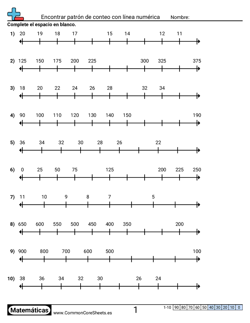 Hojas de trabajo gratis de math sobre Encontrar patrón de conteo con línea numérica. Cada hoja tiene 10 ejercicios con hoja de respuestas y es ideal para maestros y educación en casa. Puedes descargar el PDF, crear tarjetas de memoria o configurarlo para aprendizaje en línea.