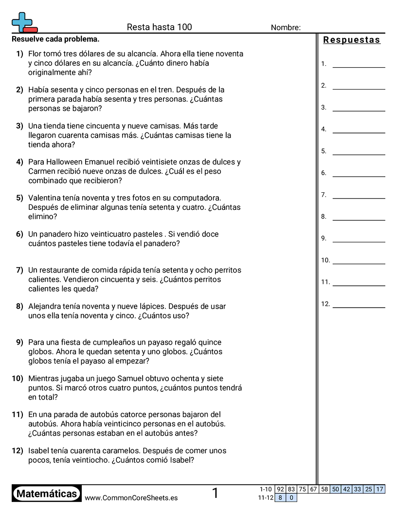 Hojas de trabajo gratis de math para 2do Grado (2oa1) sobre Resta hasta 100. Cada hoja tiene 12 ejercicios con hoja de respuestas y es ideal para maestros y educación en casa. Puedes descargar el PDF, crear tarjetas de memoria o configurarlo para aprendizaje en línea.
