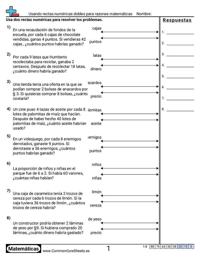 Hojas de trabajo gratis de math para 6to Grado (6rp3b) sobre Usando rectas numéricas dobles para razones matemáticas. Cada hoja tiene 8 ejercicios con hoja de respuestas y es ideal para maestros y educación en casa. Puedes descargar el PDF, crear tarjetas de memoria o configurarlo para aprendizaje en línea.