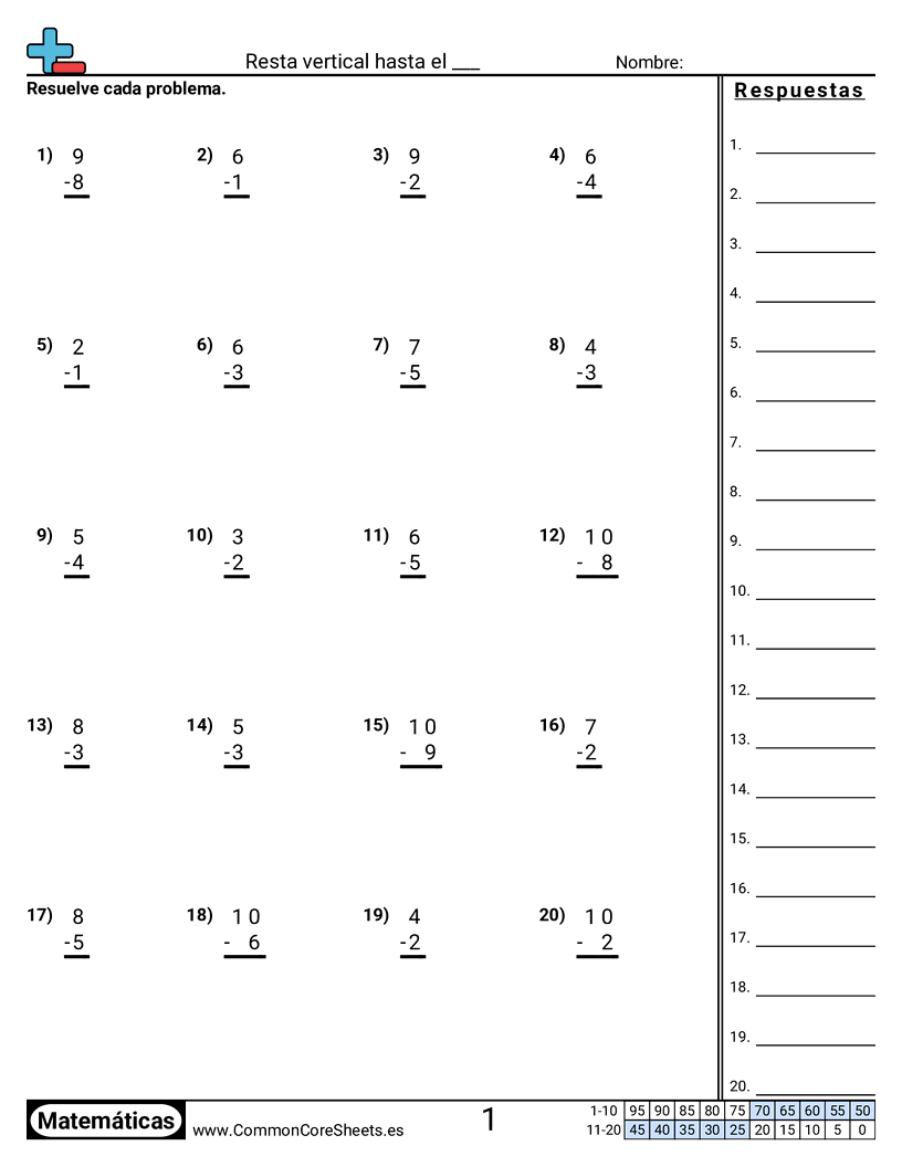 Hojas de trabajo gratis de math sobre Resta vertical hasta el ___. Cada hoja tiene 20 ejercicios con hoja de respuestas y es ideal para maestros y educación en casa. Puedes descargar el PDF, crear tarjetas de memoria o configurarlo para aprendizaje en línea.