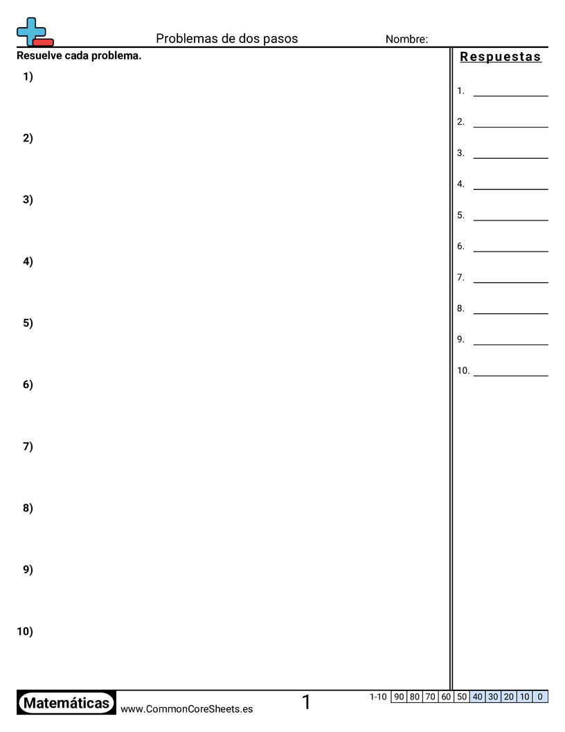 Hojas de trabajo gratis de math para 3er Grado (3oa8) sobre Problemas de dos pasos. Cada hoja tiene 10 ejercicios con hoja de respuestas y es ideal para maestros y educación en casa. Puedes descargar el PDF, crear tarjetas de memoria o configurarlo para aprendizaje en línea.